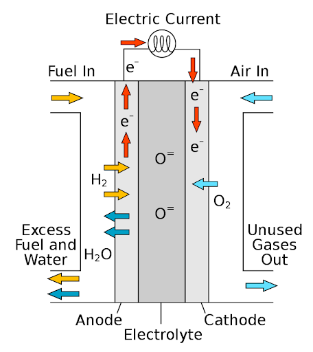 일반적인 SOFC는 산소 이온전도성 전해질과 그 양면에 위치한 공기극(양극) 및 연료극(음극)으로 이루어져 있다. 공기극에서 산소의 환원 반응에 의해 생성된 산소 이온이 전해질을 통해 연료극으로 이동하여, 다시 연료극에 공급된 수소와 반응함으로써 물을 생성하게 되면, 이 때 연료극에서 전자가 생성되고 공기극에서 전자가 소모되므로 두 전극을 서로 연결하여 전류를 발생시키는 것이 기본 작동원리이다.