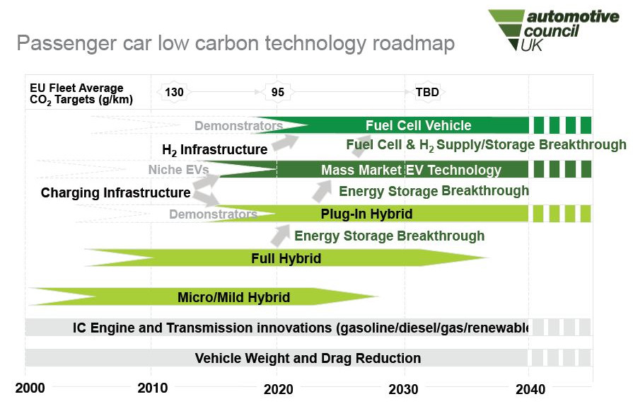 영국의 Automotive Council은 CO2 배출 감소의 최종 목적을 가진 현재 및 미래의 자동차 기술에 대한 로드맵을 마련했습니다. 보시다시피, 차량 및 내연 기관 효율의 개선은 파워 트레인의 전기 하이브리드화와 병행하여 수행됩니다.