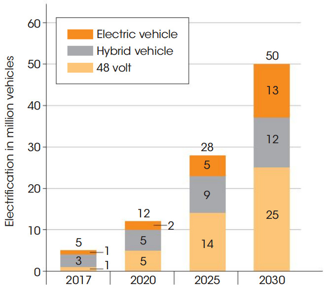 콘티넨탈에 따르면 가까운 미래에 하이브리드 및 순수 전기 자동차 (PHEV 및 순수 EV)의 시장 점유율이 지속적으로 증가 할 것이라고 합니다. 가장 큰 증가는 48V MHEV 아키텍처에서 비롯 될 것으로 예상되며 2030년까지 약 2,500 만 대가 판매 될 것입니다.