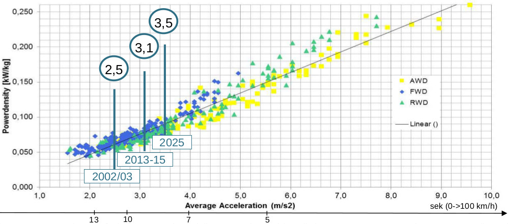 이미지 : 0-100km / h (모든 세그먼트)에 대한 전력 밀도 [kW / kg] 대 평균 가속도 [m / s2], 추세 / 예측 2002 – 2015 – 2025 (C 세그먼트 중앙값)