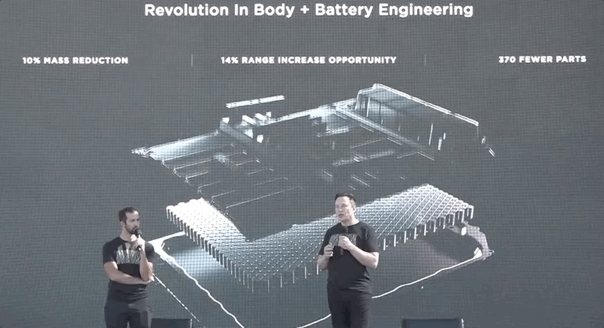 날개 안에 연료탱크를 만드는 대신 연료탱크로 비행기 날개를 만드는 항공우주 혁신에 영감을 받아 테슬라는 전면과 후면 차체 부품을 연결하는 차체 구조 역할을 하는 배터리 팩을 만들기로 했다.