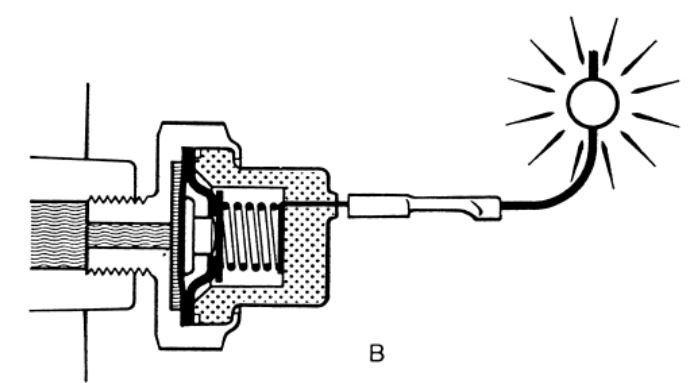 이 위치에서 오일압력 스위치 내부는 단선 상태가 되어 터미널(Terminal)과 연결된 계기판의 엔진오일 경고등은 점멸하게 된다. 반대로 오일의 압력이 낮아지면 스프링에 의해 플런저가 밀려나 접점이 붙게 되고 엔진오일 경고등은 점등하게 된다. 그림 B 참조