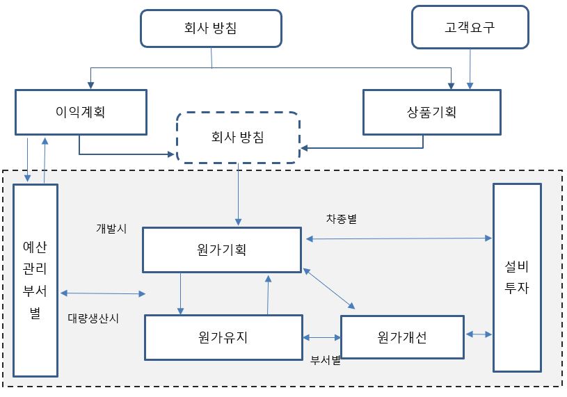 - 신제품의 적시 투입 및 제품 개발 체질 강화 : 원가관리 수준이 높아지면 제품 개발 단계별 기술정보와 원가정보를 효율적으로 공유하여 제품개발 능력을 강화 시킬 수 있음