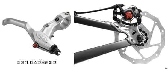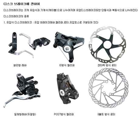 1. 유압식 디스크브레이크 : 유압 브레이크 레바, 캘리퍼, 로터, 유압호스로 구분되어 있다