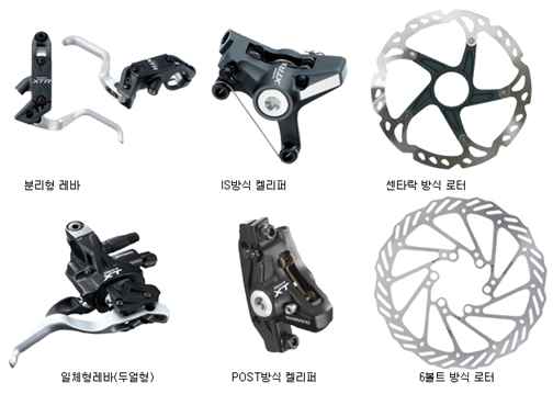 브레이크 레바: 한가지의 뭉치로 생각되고 있지만 아주 복잡하고 섬세한 구조로 되어 있으며 크게 오일탱크, 피스톤, 손잡이로 수 있으나 손잡이 간격을 조절할 수 있는 텐션볼트, 공기를 구분할 수 있으나 손잡이 간격을 조절할 수 있는 텐션볼트, 공기를 모아두는 기실 등 매우 복잡한 구조입니다.