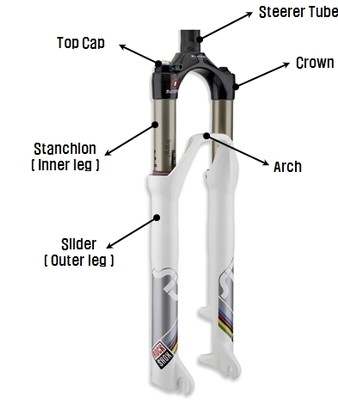 Fork의 부분 명칭은 스티어러 (steerer), 크라운(crown), 어퍼 튜브(upper tuge), 로우 레그(row leg)로 구성된다. 하지만 포크 제조사 마다 부분적인 명칭은 조금씩 다르게 부르는 경우도 있다.