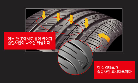 - 육안으로 보아 자동차 타이어 트레부가 규정값 이하로 마로 되어 있을 때