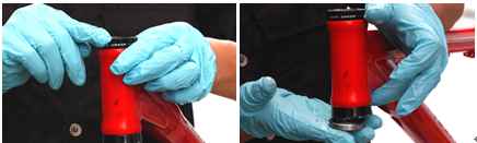 ②자전거 헤드셋 장착(헤드 프레스) 공구를 이용하여 헤드셋컵을 헤드 튜브에 장착한다. 이때 헤드셋과 헤드 튜브가 서로 어긋나지 않도록 주의하여 장착한다.