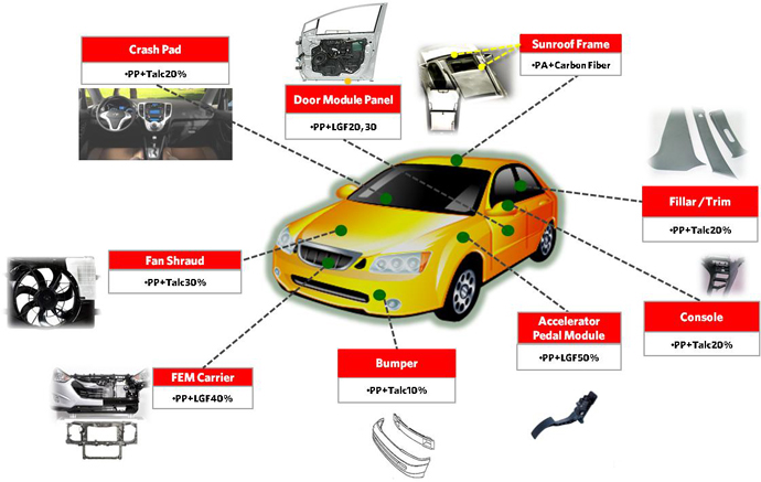 자동차(1500cc기준) 1대를 만드는데 사용되는 복합수지는 약 50kg이고 자동차 이외에도 전자, 가전부품 에도 사용되고 있다.