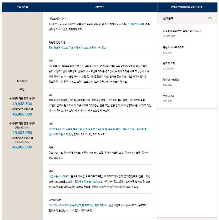 코나(KONA) 전기차 트림별 가격