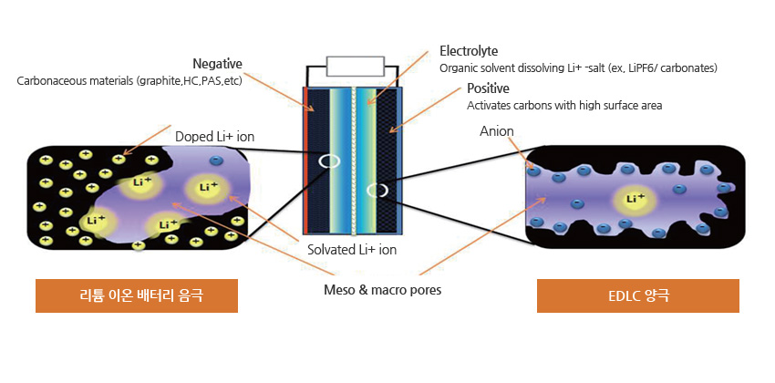 리튬이온 캐패시터(LIC : Lithium-ion Capacitor)는 전기이중층 캐패시터(EDIC : Electric Double Layer Capacitor)와 리튬이온 2차 전지(LIB)의 특징을 겸비하는 하이브리드 캐패시터(Hybrid Capacitor)이며, 고 에너지 밀도, 신뢰성, 긴수명, 안정성으로 인해 활발하게 진행되고 있다.