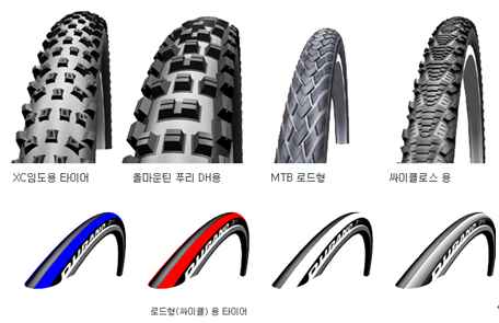 타이어는 바퀴의 바깥쪽에 위치하여 단단한 요철이 있는 고무재질로 만들어졌다. 타이어의 사이즈는 용도에 따라 높이와 폭이 다양하다. MTB 타이어의 공기압은 일반적으로 35psi ~ 60psi가 평균 이다. 하지만 타이어마다 조금씩 다를 수 있다. 사이클 타이어는 80psi ~ 120psi가 평균이다.